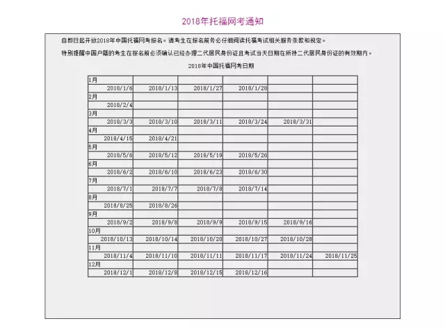 摘要:2018年托福® 考试现在开始注册啦!如果你打算在明年参加托福考试,那就快来在时间注册理想考位。以下是2018托福® 考试日期安排: